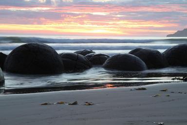 | Keywords: outdoor The Moeraki Boulders are unusually large and spherical boulders lying along a stretch of Koekohe Beach on the wave-cut Otago coast of New Zealand between Moeraki and Hampden. They occur scattered either as isolated or clusters of boulders within a stretch of beach where they have been protected in a scientific reserve. The erosion by wave action of mudstone, comprising local bedrock and landslides, frequently exposes embedded isolated boulders. These boulders are grey-colored septarian concretions, which have been exhumed from the mudstone enclosing them and concentrated on the beach by coastal erosion. The most striking aspect of the boulders is their unusually large size and spherical shape, with a distinct bimodal size distribution. Approximately one-third of the boulders range in size from about 0.5 to 1.0 metre (1.6 to 3.3 ft) in diameter, the other two-thirds from 1.5 to 2.2 metres (4.9 to 7.2 ft). Most are spherical or almost spherical, but a small proportion are slightly elongated parallel to the bedding plane of the mudstone that once enclosed them. The rock comprising the bulk of a boulder is riddled with large cracks called septaria that radiate outward from a hollow core lined with scalenohedral calcite crystals. en.wikipedia.org/wiki/Moeraki_Boulders en.wikipedia.org/wiki/Dawn The Moeraki Boulders are unusually large and spherical boulders lying along a stretch of Koekohe Beach on the wave-cut Otago coast of New Zealand between Moeraki and Hampden. They occur scattered either as isolated or clusters of boulders within a stretch of beach where they have been protected in a scientific reserve. The erosion by wave action of mudstone, comprising local bedrock and landslides, frequently exposes embedded isolated boulders. These boulders are grey-colored septarian concretions, which have been exhumed from the mudstone enclosing them and concentrated on the beach by coastal erosion. The most striking aspect of the boulders is their unusually large size and spherical shape, with a distinct bimodal size distribution. Approximately one-third of the boulders range in size from about 0.5 to 1.0 metre (1.6 to 3.3 ft) in diameter, the other two-thirds from 1.5 to 2.2 metres (4.9 to 7.2 ft). Most are spherical or almost spherical, but a small proportion are slightly elongated parallel to the bedding plane of the mudstone that once enclosed them. The rock comprising the bulk of a boulder is riddled with large cracks called septaria that radiate outward from a hollow core lined with scalenohedral calcite crystals. en.wikipedia.org/wiki/Moeraki_Boulders en.wikipedia.org/wiki/Dawn |