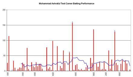 | Keywords: Mohammad Ashraful graph.png Test Match performance of Mohammad Ashraful It was created by Raven4x4x The red bars indicate the player's test match innings while the blue line shows the average of the ten most recent innings at that point Note that this average cannot be calculated for the first nine innings The blue dots indicate innings in which Ashraful finished not-out This graph was generated with Microsoft Excel 2002 using data from Cricinfo http //stats cricinfo com/statsguru/engine/player/55988 html class 1;orderby start;template results;type batting;view innings and Howstat http //www howstat com au/cricket/Statistics/Players/PlayerProgressBat asp PlayerID 2964 The information in this graph is current as of 30 March 2008 2007-12-30 Own Raven4x4x wikipedia en Raven4x4x original upload log page en wikipedia Mohammad_Ashraful_graph png 2007-12-30 06 24 Raven4x4x 986×574 4714 bytes <nowiki>This graph details the Test Match performance of Mohammad Ashraful It was created by Raven4x4x The red bars indicate the player's test match innings while the blue line shows the average of th</nowiki> 2008-01-19 07 31 Raven4x4x 986×574 4833 bytes <nowiki>Updated The information in this chart is current as of 19 January 2007 </nowiki> 2008-03-30 06 21 Raven4x4x 986×574 4892 bytes <nowiki>Updated The information in this graph is current as of 30 March 2008 </nowiki> DEFAULTSORT Ashraful Mohammad 1984 births Bangladesh Test cricketers Cricket graphs |