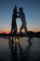 Keywords: molecule men berlin spree treptower park sculpture artwork monument bundestag government district river night sunset