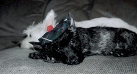 Keywords: Molly-1.jpg 15wk Scottish terrier puppy Taken by my mom released by her into public domain 2005-10-23 own assumed Purplefeltangel~commonswiki Brindle dogs Dog headgear Scottish Terrier puppies Two dogs Lying dogs