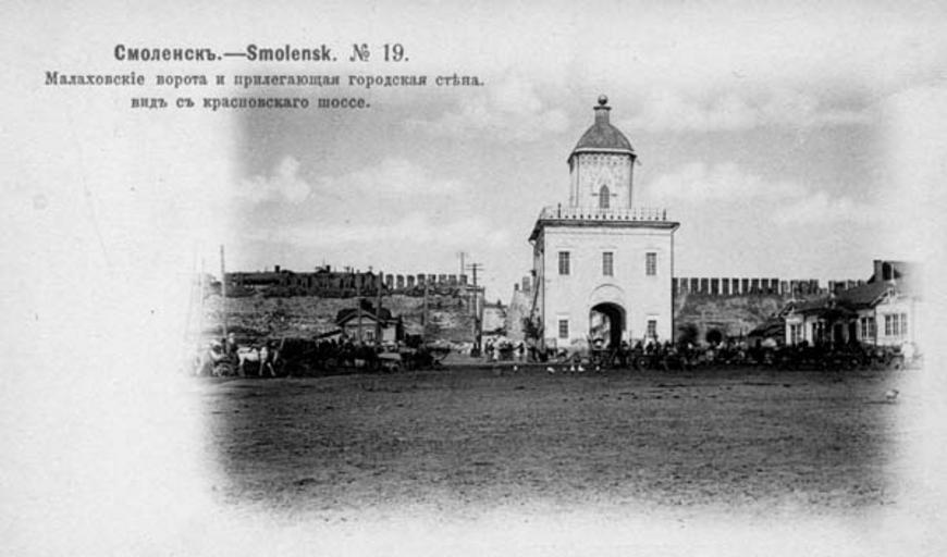 | Keywords: Molohovskie gate.jpg  en View on Molohovskie gate now do not exist from the current Victory Square ru Вид на  олоховские во ота ныне не существуют со сто оны нынешней площади Победы О игинальная отк ытка  е установлены before 1917 года PD-RusEmpire 20th-century postcards Postcards of Smolensk Molohovskie gate |