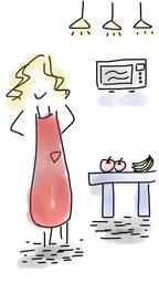 Keywords: mom cooking kitchen housewife woman mother food home lifestyle microwave healthy food fruit apples bananas apron meal appliance dinner light pendant light interior living supper table lighting sketch doodle