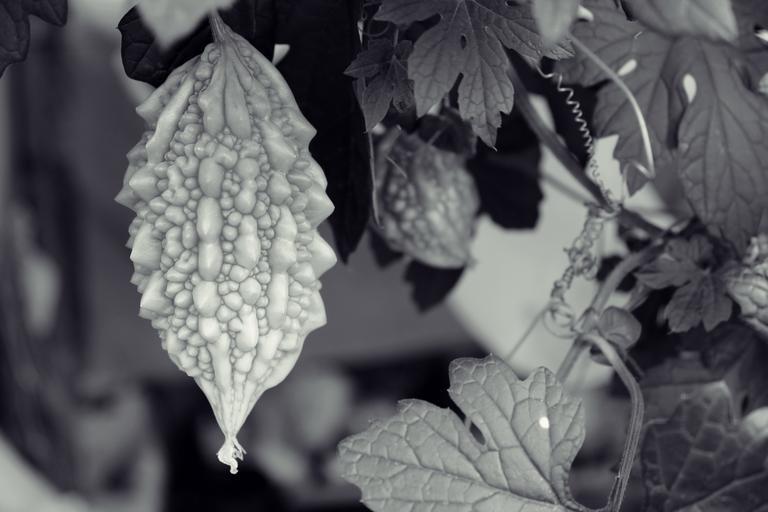 Keywords: momordica plant fruit leaves berry green fresh summer day in the summer time garden closeup harvest food plants
