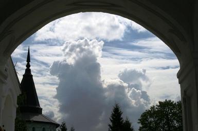 Keywords: monastery historic religion russian orthodox arch roof spire trees cumulus clouds stratus clouds sky