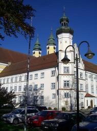Keywords: monastery red on red klosterhof convent building monastery church church steeples bright blue sky