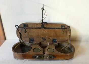 | Keywords: Money scales, England, 1630-1660, maple, brass, steel - Concord Museum - Concord, MA - DSC05938.JPG en Exhibit in the Concord Museum Concord Massachusetts USA 2014-12-30 14 36 18 own Daderot other versions PD-old-100 cc-zero Collections of the Concord Museum Coin scales |