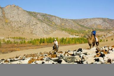 Keywords: mongolia landscape mountains sheep sky trees men horses herding driving livestock nature outside valley country countryside