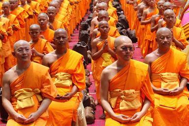 Keywords: monk buddhists sitting elderly old bald tradition ceremony robe orange people thailand thai asia zen group formation peace wat phra dhammakaya temple dhammakaya pagoda more than million budhas gold buddhism