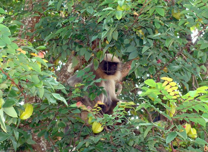 Keywords: monkey hanuman langur animal mamma primate wil wildlife fauna old world tree starfruit tree fruits dharwad india