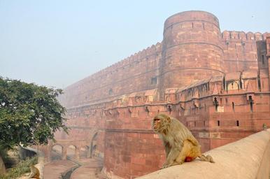 Keywords: monkey magot animals the red fort building architecture monument the walls fortress agra india the fog the fortifications