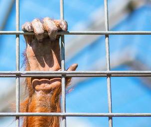 Keywords: monkey orang utan monkey hand zoo nature tiergarten grid imprisoned caught