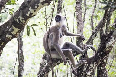 Keywords: monkeys animals mammals sitting alone isolated wildlife forest trees woods wooden trunks woody stems nature green leaves flora fauna natural parks zoo
