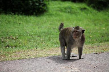Keywords: monkeys animals mammals wildlife forest roads greenery lawns grasses flora fauna baby young small grey gray