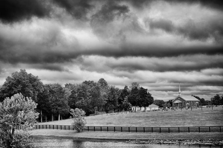 Keywords: monochrome black and white country rural landscape barn field countryside grass fence farm farmland outdoor scene land agricultural lawn sky pond church