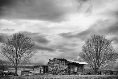 Keywords: monochrome black and white landscape rural country scenic shack barn sky trees building outdoor bw