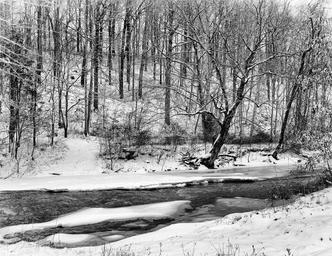 Keywords: monochrome black and white landscape rural country scenic trees outdoor bw stream creek water snow winter