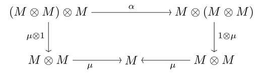 | Keywords: Monoid Associator Coherence.svg Coherence diagram for associator for monoid object in a monoidal category Created as per en meta Help Displaying a formula Commutative diagrams <pre> \documentclass amsart \usepackageall ps dvips xy Loading the XY-Pic package Using postscript driver for smoother curves \usepackage color For invisible frame \begin document \thispagestyle empty No page numbers \SelectTips eu Euler arrowheads tips \setlength \fboxsep 0pt Frame box margin \color white \framebox \color black Frame for margin \xymatrix M \otimes M \otimes M \ard_ \mu \otimes 1 \arrr \alpha M \otimes M \otimes M \ard 1 \otimes \mu \\ M \otimes M \arr_ \mu M M \otimes M \arl \mu end math end frame \end document </pre> 2009-03-30 Tyrrell McAllister Commutative diagrams of binary operations Xy-pic diagrams Images with LaTeX source code |