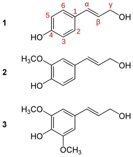 Keywords: Monolignols general.svg en structures of paracoumaryl alcohol 1 ; coniferyl alcohol 2 and sinapyl alcohol 3 de Strukturen von Cumarylalkohol 1 Coniferylalkohol 2 und Sinapylalkohol 3 Own Yikrazuul 5 3 09 Phenylpropanoids