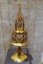 | Keywords: Monstrance from St. Mary of the Assumption in Herzogenrath, Aachen, c. 1510, gilt copper, glass - Museum Schnütgen - Cologne, Germany - DSC00081.jpg en Exhibit in the Museum Schnütgen - Cologne Germany 2015-11-29 08 37 25 own Daderot other versions PD-old-100 cc-zero Metalwork in Museum Schnütgen Monstrances in Germany Tower monstrances St Maria Himmelfahrt Herzogenrath | ||||