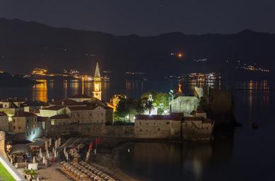 Keywords: montenegro night fortress night city night lights mountains reflection in the water beauty budva
