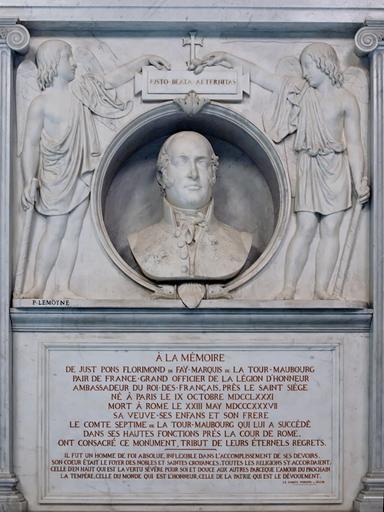 | Keywords: Monument Just Florimond de la Tour-Maubourg.jpg Monument to Just Pons Florimond de Faÿ 1781-1837 marquis of La Tour-Maubourg French ambassador to the Holy See Marble relief by Paul Lemoyne 1783-1873 San Luigi dei Francesi in Rome Italy Monument à Just Pons Florimond de Faÿ 1781-1837 marquis de la Tour-Maubourg ambassadeur du roi des Français près le Saint-Siège Marbre bas-relief par Paul Lemoyne 1783-1873 Église Saint-Louis-des-Français à Rome Own 2006 Jastrow Paul Lemoyne Marble sculptures Stone sculptures in Italy Grave busts Busts in Italy Epitaphs in Italy Peers of France-July Monarchy San Luigi dei Francesi Rome - Interior Family de Faÿ |