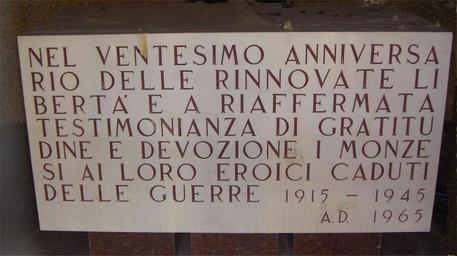 | Keywords: Monza-monumento-caduti-lapide.jpg it MB Monza lapide nel sacello del monumento ai caduti in piazza Trento e Trieste in ricordo del ventesimo anniversario della Liberazione 1945-1965 own Albertomos 2009-10-15 nessuna ImageNote 1 125 213 2772 1263 2937 1645 2 <center> NEL VENTESIMO ANNIVERSA RIO DELLE RINNOVATE LI BERTA ™ E A RIAFFERMATA TESTIMONIANZA DI GRATITU DINE E DEVOZIONE I MONZE SI AI LORO EROICI CADUTI DELLE GUERRE 1915 - 1945 A D 1965 </center> ImageNoteEnd 1 Plaques in Monza Plaques referencing 1915 Plaques referencing 1945 Plaques installed in 1965 |