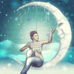 Keywords: moon girl fantasy jeans female night sky woman light portrait dream blue moonlight style face romantic joy star love magic happy celebration romance model mystery fairy 3d render photo manipulation book cover