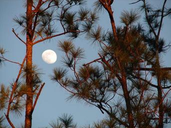 Keywords: moon lunar pines pine trees blue sky moonlight celestial september nature dusk twilight sunlight