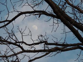 Keywords: moon through fall trees moon moonlight bare tree branches moon hidden in trees moon in blue sky with clouds cloudy cloudy moon