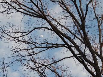Keywords: moon through fall trees moon moonlight bare tree branches moon hidden in trees moon in blue sky with clouds cloudy cloudy moon