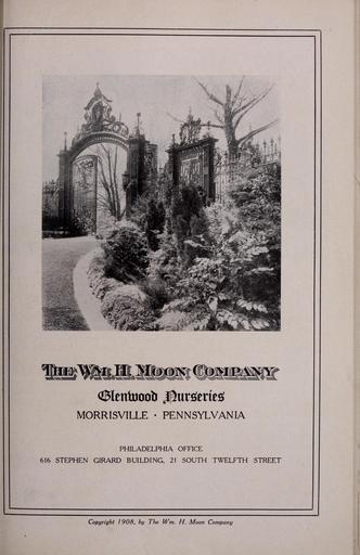 | Keywords: Moon's hardy trees and plants for every place and purpose (16144239794).jpg Beades assisting in planning this garden we supplied and planted the stock in it <br> Successful Landscape Planting <br> In planting a new lawn or in remodeling an old one it is best to have an expert acquainted wit <br> trees and plants to help in arranging them in the most artistic and effective way Let us who have ha I <br> tion and soil <br> The groupings of flowers and shrubbery or the location of trees must be so placed that they wiji <br> produce a harmonious whole that makes the lawn abound in interest and beauty At the same time <br> they must fulfil their mission of giving shade or hiding from view some unsightly object ; framing som <br> vista with foliage making a display of flowers and enhancing the beauty of the place to the owner'; <br> satisfaction <br> Consult us about planting plans that will help you to get such results We solicit correspondenc <br> with all who contemplate improving and beautifying their grounds whether it be on the lawn of th <br> modest home or on the larger estates <br> so much experience in planting lawns assist in making yours You will get better results for the mone;j <br> expended and will be saved the expense and disappointment of planting things unsuited for your local <br> HE AN M II Moon CoMPAXf <br> V urseries at <br> M orTisville Pa <br> 21 SOUTH TWELFTH STREET <br> PHILADELPHIA PA <br> 2 <br> GLENWOOD NURSEREE 45198799 161038 84658 Page 1 Title Page http //www biodiversitylibrary org/page/45198799 1908 Moon Samuel C Firm ; Moon William H Co Biodiversity Heritage Library Moon's hardy trees plants for every place purpose Garden Stories Berries Catalogs Climbing plants Evergreens Flowering shrubs Fruit trees Moon William H Co Morrisville Bucks County Nurseries Horticulture Nursery stock Nut trees Ornamental trees Pennsylvania Perennials Pinopsida Rosa Shade trees Shrubs Trees Mertz Library The New York Botanical Garden bhl page 45198799 dc identifier http //biodiversitylibrary org/page/45198799 bhlGardenStories BHLinbloom moon william h co morrisville bucks county nurseries horticulture mertz library the new york botanical garden bhlgardenstories bhlinbloom Information field Flickr posted date ISOdate 2015-03-09 Check categories 2015 August 24 CC-BY-2 0 BioDivLibrary https //flickr com/photos/61021753 N02/16144239794 2015-08-24 01 50 45 cc-by-2 0 PD-old-70-1923 1908 books Moon's hardy trees plants for every place purpose Photos uploaded from Flickr by Fæ using a script |