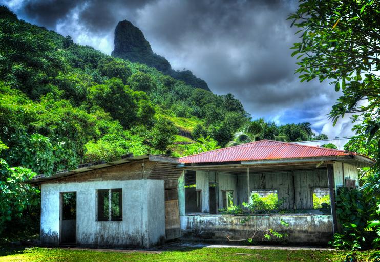 Keywords: moorea french polynesia abandoned house mountain clouds sky green nature tropical vacation paradise outdoors landscape holiday summer tourism exotic tree