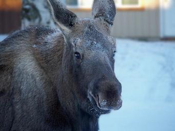 | Keywords: moose at our house atourhouse nunaka valley nunakavalley anchorage alaska The story of my life! I drive over to Far North Bicentennial Park, hiked out into the woods, it's 7 degrees (13C) but very sunny. I was looking to photograph Hoar Frost and Moose... but Moose are always at the top of my list. After 1.5 hours, my hands frozen, and no Moose, I went home. 10 minutes later, Sailor goes crazy barking at the front window and there were two Moose right next to the living room window in our front yard! So I stepped outside the garage side door and talked with them for a while and took their photographs, but only after the one said it was "OK." They were very friendly and very accustomed to humans. The story of my life! I drive over to Far North Bicentennial Park, hiked out into the woods, it's 7 degrees (13C) but very sunny. I was looking to photograph Hoar Frost and Moose... but Moose are always at the top of my list. After 1.5 hours, my hands frozen, and no Moose, I went home. 10 minutes later, Sailor goes crazy barking at the front window and there were two Moose right next to the living room window in our front yard! So I stepped outside the garage side door and talked with them for a while and took their photographs, but only after the one said it was "OK." They were very friendly and very accustomed to humans. |