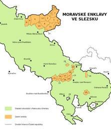| Keywords: Moravske.enklavy.ve.Slezsku.png Území enkláv se skládalo z následujících celků čísla odpovídají číslům na mapě Osoblažská enkláva německy Hotzenplotzer Ländchen celá území bývalých soudních okresů Jindřichov a Osoblaha bylo největším územím v Enklávách o rozloze 219 32 km² a je dnes výběžkem Česka do Polska Patřily k němu tyto obce 1 Bohušov též Dolní Povelice Karlov Kašnice Ostrá Hora dnes části Bohušova 2 Dívčí Hrad též Sádek Životice dnes části Dívčího hradu 3 Hlinka 4 Janov 5 Jindřichov 6 Liptaň též Bučávka Horní Povelice dnes části Liptaně 7 Osoblaha též Studnice dnes část Osoblahy 8 Petrovice 9 Rusín včetně Hrozové a Matějovic ale bez parcely 246/2 která byla původně součástí polského Slezska 10 Slezské Pavlovice původně Německé Pavlovice s výjimkou malého dříve slezského území mezi Prudnikem a Sádeckým potokem 11 Slezské Rudoltice původně Rudoltice též Koberno Nový les Víno dnes části Slezských Rudoltic a 12 Vysoká též Bartultovice Pitárné dnes části Vysoké ; dále pak katastrální území 13 Piskořov dnes část Města Albrechtice a 14 Třemešná dnes část obce Třemešná Historickou součástí Osoblažska jsou i některé pozemky které byly roku 1959 předány Polsku výměnou za jiné Moravský výběžek v okolí Litultovic a Životic zasahující až na současné území statutárního města Opavy Tato část měla rozlohu 72 01 km² Jedná se o obce 15 Lhotka u Litultovic 16 Litultovice s výjimkou Choltic které nebyly součástí původního katastru Litultovic 17 Dolní Životice též Hertice dnes část Dolních Životic 18 Mikolajice 19 Uhlířov 20 Slavkov a o katastrální území 21 Deštné dnes část obce Jakartovice 22 Jaktař dnes část statutárního města Opavy a 23 Štáblovice dnes součást obce Štáblovice Katastrální území 24 Vlaštovičky dnes součást opavské městské části Vlaštovičky Tato enkláva měla rozlohu 2 5056 km² Území obce 25 Slatina včetně jejích někdejších místních částí Ohrada dnes část obce Bílovec a Karlovice dnes část obce Tísek Tato enkláva měřila 2 51 km² 26 Suché Lazce bez osady Přerovce ale s malou částí parcely číslo 459/1 v katastrálním území obce Štítiny a včetně Kravařova který je dnes součástí katastrálního území Komárova u Opavy Tato enkláva měřila 5 22 km² Další enklávou bylo panství Ketř mimo mapu od roku 1742 součást Pruského Slezska jako tzv Pruská Morava; dnes pod jménem Kietrz součást polského Opolského vojvodství Rakouská část enkláv měla rozlohu 308 26 km² K enklávám se od roku 1783 nepočítala katastrální území 27 Butovice a 28 Nové Vrbno která sice byla obklopena slezským územím nicméně až do roku 1948 byla spravována v rámci moravského politického okresu Nový Jičín Moravian enclaves in orange in Silesia 1783-1928 own User Amic / User Kirk Maps of the Czech Republic Location not applicable Maps of Czech Silesia Maps of Moravia Moravian enclaves in Silesia |