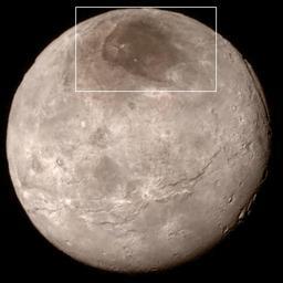| Keywords: Mordor Macula context.png en Mordor Macula is located at Charon A large dark area about 475 km in diameter near the north pole of Charon Pluto's largest moon It is named after the shadow lands in J R R Tolkien's The Lord of the Rings The name is not official; the discovery team has been using the name informally and may submit it to the IAU It is not currently known what Mordor is It may be frozen gases captured from Pluto's escaping atmosphere a large impact basin or both 2015-07-13 File Nh-charon jpg PlanetUser image courtesy of NASA other versions Custom license marker 2015 12 16 Photos of Charon by New Horizons Uploaded with UploadWizard |