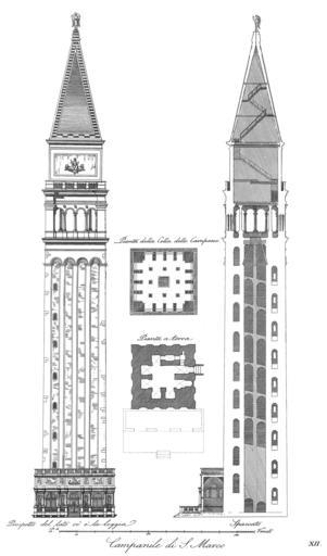 | Keywords: MorettiPiazzaSanMarco12Campanile.png View vertical section and ground-plans of the Campanile San Marco in Venezia i e Venice Venedig etc in Italy before it crashed in 1902 The present campanile is a true copy of this original building so this picture also applies to today ™s building Ansicht Schnitt und Grundrisse des Campanile San Marco in Venedig d h Venezia in Italien vor dem Einsturz von 1902 Der heutige Campanile ist eine genaue Kopie des Originals so dass dieses Bild auch zum heutigen Gebäude passt Vista sezione e pianta del Campanile San Marco a Venezia prima del crollo del 1902 L'attuale campanile è stato ricostruito come copia del precedente Antonio Quadri text and Dionisio Moretti pictures La piazza di San Marco in Venezia printed in Venezia in 1831 12th table Antonio Quadri Text und Dionisio Moretti Bilder La piazza di San Marco in Venezia gedruckt 1831 in Venedig 12 Tafel Antonio Quadri testo and Dionisio Moretti immagini La piazza di San Marco in Venezia stampato a Venezia nel 1831 12 tavola 1831 Creator Dionisio Moretti Scanned by Aristeas PD-old thumb left New and better scan of this image PD-old-100 Floor plans of Italy 1831 Campanile Piazza San Marco 1831 works in Italy Campanile Piazza San Marco Drawings of the Campanile of St Mark's Basilica 1831 Piazza San Marco Venice in art 1831 La Piazza di San Marco in Venezia by Quadri and Moretti 1831 Historical images of the Loggetta by Sansovino |