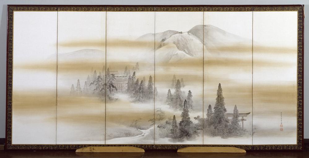 | Keywords: Mori Kansai - Kamigamo Shrine in Summer - Walters 35147.jpg The Kamigamo Shrine is the oldest Shinto shrine in the former Japanese capital of Kyoto It is dedicated to the deity Kamo-wake-ikazuchi who appeared miraculously to a daughter of the ruling clan while she was performing a purification ritual in the Kamo River The deity was initially enshrined at the top of Mount Ko seen in the distance but was transferred to this 7th-century building during the Heian period The mate to this screen also in the Walters' collection 35 148 depicts the Byodo-in a famous Buddhist temple in the nearby town of Uji between 1860 1870 Edo-Meiji ink and gold wash on paper with hints of color cm 47 136 5 accession number 35 147 35616 Dealer Osaka Toyobi Far Eastern Art Dr Frederick Baekeland and Joan D Baekeland 1987-1988 mode of acquisition unknown Walters Art Museum 1989 by purchase Museum purchase with funds provided by the W Alton Jones Foundation Acquisition Fund 1989 Signature Lower right side of righthand panel Kansai Sho O Mori Koshuka; Seal Tachibana Koshuka in Jinichi Shiyo place of origin Kyoto Japan Walters Art Museum license 2D Japanese paintings in the Walters Art Museum Mori Kansai Media contributed by the Walters Art Museum needs category review |