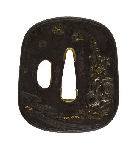 | Keywords: Morikawa Toshikage - Tsuba with Stone Rabbit with a Blossoming Plum Branch - Walters 51371.jpg On the right of this tsuba is a stone rabbit with a branch of plum blossoms in its back Two birds fly over the central opening A stream is shown at the lower left Rabbits are one of the zodiac animals and often depicted in Japanese art On the reverse are a pine branch by a river and a full moon at the upper right 1864 late Edo iron gilt gold silver cm 6 8 accession number 51 371 20775 Henry Walters Baltimore date and mode of acquisition unknown Walters Art Museum Henry Walters Acquired by Henry Walters Signature Hôshinsai/Toshikage; Date Genji ki-no-e ne chûshû/ kao ; Translation Mid-autumn Genji year of the rat 1864 place of origin Edo present-day Tokyo Japan Walters Art Museum license Tosogu Japanese sword fittings in the Walters Art Museum Morikawa Toshikage Media contributed by the Walters Art Museum needs category review |