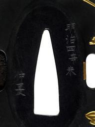 | Keywords: Morimiya Toshinori - Tsuba with Autumn Grasses - Walters 5112442 - Mark A.jpg This tsuba is decorated with three of the celebrated autumn grasses On the front are arrowroot and pampas grass On the reverse is mist flower This is part of a mounted set 1871 Meiji shakudo gold nigurome cm 6 2 accession number 51 1244 2 19056 Henry Walters Baltimore date and mode of acquisition unknown Walters Art Museum Henry Walters Acquired by Henry Walters Date Meiji yon kanoto hitsuji chûka; Translation Meiji 4 1871 year of the sheep mid summer; Signature Ryûseimin Toshinori kao place of origin Tokyo Japan Walters Art Museum license Tosogu Japanese sword fittings in the Walters Art Museum Morimiya Toshinori Media contributed by the Walters Art Museum needs category review |