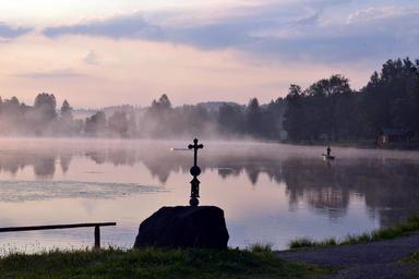 Keywords: morning bayersoien bavaria lake foggy fog mood morning hour fish sunrise idyll landscape cross rest sign of the cross harmony clouds mirror image