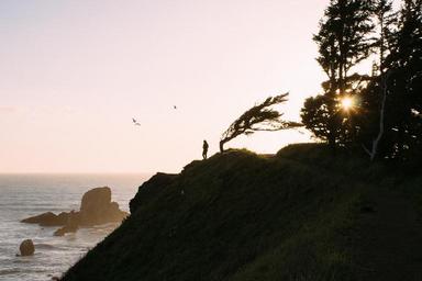 Keywords: morning shore coast seaside ocean water sea wind after storm trees vegetation cliff rocks nature horizon person alone seascape