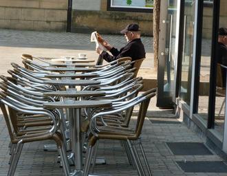 Keywords: morning spring city dining tables newspaper readers