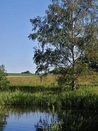 Keywords: morning summer pond landscape trees nature south bohemia blue sky birch reeds meadow reflection blue water-level