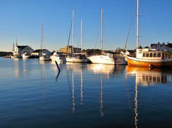 Keywords: morning sun boats water coast mirroring sailing boats sail masts peaceful quiet blue norway south norway homes sea partly cloudy