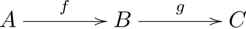Keywords: Morphism-Composition.svg Die Komposition zweier Morphismen <math>f</math> von <math>A</math> nach <math>B</math> und <math>g</math> von <math>B</math> nach <math>C</math> Own 2006-08-13 Markus Schmaus Public Domain Quelltext Siehe wikipedia de Benutzer Markus Schmaus/Kommutatives Diagramm <pre> latex \documentclassa4paper article \usepackagedvips matrix arrow ps color line curve frame xy \usepackage diagxye \thispagestyle empty \begin document \bfig \morphism 0 0 <500 0>A`B;f \morphism 500 0 <500 0>\phantom B `C;g \efig \end document </pre> Category theory Composition mappings Images with LaTeX source code