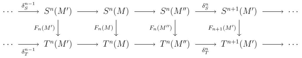 Keywords: MorphismOfDeltaFunctors.png math en A commutative diagram showing a morphism of -functors Own work using LaTex and dvipng RobHar 2008-12-26 Data file The LaTeX code used to produce this diagram is the following \\begin CD \cdots > \delta_S n-1 >>S n M \prime >>> S n M >>>S n M \prime\prime > \delta_S n >>S n+1 M \prime >>>\cdots \\ V F_n M \prime VV V F_n M VV V F_n M \prime\prime VV V F_ n+1 M \prime VV\\ \cdots >> \delta_T n-1 > T n M \prime >>> T n M >>>T n M \prime\prime >> \delta_T n >T n+1 M \prime >>>\cdots \end CD \ Complexes algebra |