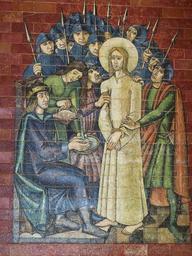 Keywords: mosaic passion fatima place of pilgrimage pilgrimage portugal believe make a pilgrimage pilgrim religion christianity church image suffering christ good friday crucifixion soldiers caught interrogation process