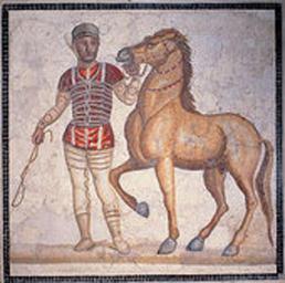 | Keywords: Mosaic red charioteer Massimo.jpg Pavement mosaic with a circus charioteer of the albata white faction Roman artwork first half of the 3rd century CE From the Villa dei Severi at Baccano 16 miles from the Via Appia Mosaïque de pavement à l'aurige à casaque blanche représentant l'une des quatre factions du cirque Œuvre romaine première moitié du IIIe siècle ap J -C Provenance villa des Sévères à Baccano à 16 milles de la Via Appia Mosaico pavimentale con aurigho del circo Creazione romana prima metà del III sec d C Da un cubicolo della Villa dei Severi in Baccano al XVI miglio della Via Appia ancient Museum Palazzo Massimo Second floor object history credit line accession number inet other versions <gallery> Image Mosaic blue charioteer Massimo jpg </gallery> PD-Art Charioteers Leisure in ancient Rome Ancient Roman mosaics in the Palazzo Massimo alle Terme Charioteers 3rd-century mosaics in Italy Rome Mosaics of horses Files uploaded by Shakko from various sources |