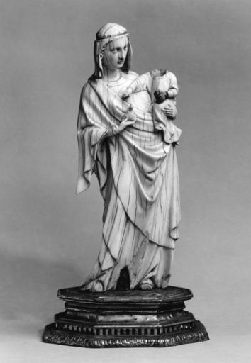 | Keywords: Mosan - Virgin and Child - Walters 71241.jpg The standing figure of the Virgin is very thin almost pointed at the sides Her drapery is fully developed on the back displaying a complex series of folds at the haunch and at the bottom of the skirt The head veil is carefully carved in overlapping folds There is a rectangular hole in the center of the back for attachment to a shrine The carver of this ivory was working outside the conventional formulas of French sculpture with the wide unusual sweep of apron-style drapery across the figure of the Virgin and the free-floating pendant of drapery hanging from her right sleeve which breaks the outline of the figure The hands and wrists are unusually delicate and the Virgin stares vacantly into space These features relate the ivory to a group of marble sculptures showing unusual treatment of the drapery from 1340 to about 1370 Unlike the eyes of the marble figures which were probably painted the pupils of the eyes of the ivory are drilled The Virgin's crown and the Child's head are missing The Virgin's skirt has a large chip in the center from the iron spike of the later copper-gilt base several minor chips and a truncated toe of each foot Considerable traces of red paint may be seen on the rear of the Virgin's robe The Child's left hand which holds an apple is an old replacement in wood with traces of polychrome 3rd quarter 14th century Medieval ivory polychromy copper-gilt base wood cm 20 4 accession number 71 241 4357 Brizard Collection date and mode of acquisition unknown Jacques Seligmann Paris date of acquisition unknown by purchase Henry Walters city Baltimore Walters Art Museum Henry Walters Acquired by Henry Walters 1914 place of origin Belgium Walters Art Museum license Medieval ivory in the Walters Art Museum Media contributed by the Walters Art Museum needs category review Madonna and Child Maasland Limburg Madonna with apple |