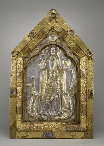 Keywords: Mosan Workshop - Reliquary Panel of the Triumphant Christ - Walters 57519.jpg The image of the triumphant Christ is taken from Psalm 91 You will tread on the lion and the adder the young lion and the serpent you will trample underfoot This and another panel now in the British Museum London might once have been part of a large reliquary chasse made in the twelfth century to hold the remains of Saint Oda of Amay When a new chasse for Saint Oda was made in the thirteenth century these pieces of the older reliquary were not discarded but refashioned into separate smaller reliquaries In fact the now lost twelfth-century chasse itself was made with recycled materials the figure of Christ triumphantly trampling the beasts seen on the Baltimore reliquary appears to be even older perhaps taken and reused from an eleventh-century altar frontal Panel late 11th century; Frame 13th century Medieval silver gilded silver with champlevé enamel and horn bovine H 23 1/16 x W 14 15/16 x D at metal surface 1 15/16 in 58 5 x 38 x 5 cm ; D with rock crystal cm 5 56 accession number 57 519 5868 Hollingworth Magniac Colworth Bedford prior to 1862 by purchase Charles Magniac Colworth 1867 by inheritance Colworth Collection Sale Christie's London July 4 1892 no 494 A Tollin Paris date of acquisition unknown by purchase A Tollin Sale Hotel Drouot Paris May 20 1897 no 93 Jacques Seligmann Paris date of acquisition unknown by purchase Henry Walters Baltimore ca 1900 by purchase Walters Art Museum Henry Walters Acquired by Henry Walters ca 1900 Masterpieces of Art Century 21 Exposition Seattle World's Fair Seattle World's Fair Seattle 1962 Treasures of Heaven The Cleveland Museum of Art Cleveland; The Walters Art Museum Baltimore; The British Museum London 2010-2011 place of origin east Belgium Walters Art Museum license Medieval metalwork in the Walters Art Museum Metalwork by Mosan workshops Rhine-Meuse champlevé Media contributed by the Walters Art Museum needs category review Oda of Amay Psalm 91 |